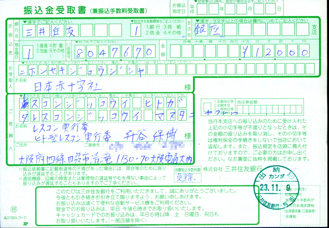 本家レスコン実行委員会の委託を受けて、当日会場で「レスキューホイッスル」(1個200円)を販売したところ、皆様に60個お買い上げいただきました。売上金12,000円は全て日本赤十字社の東日本大震災義援金の口座へ振り込みました。