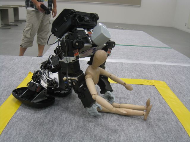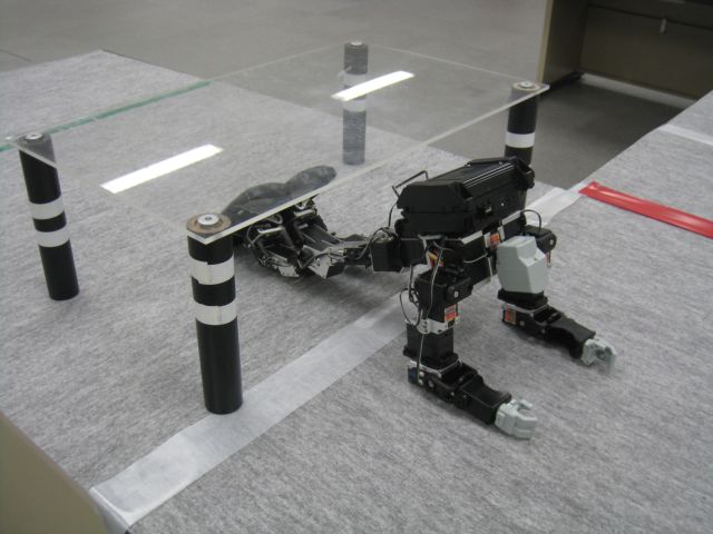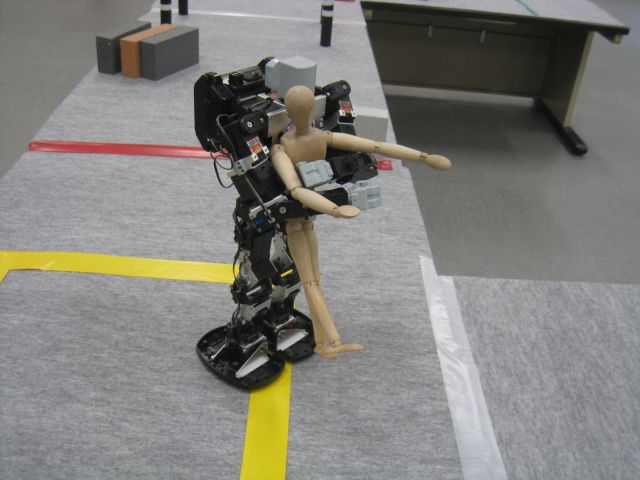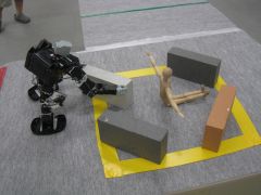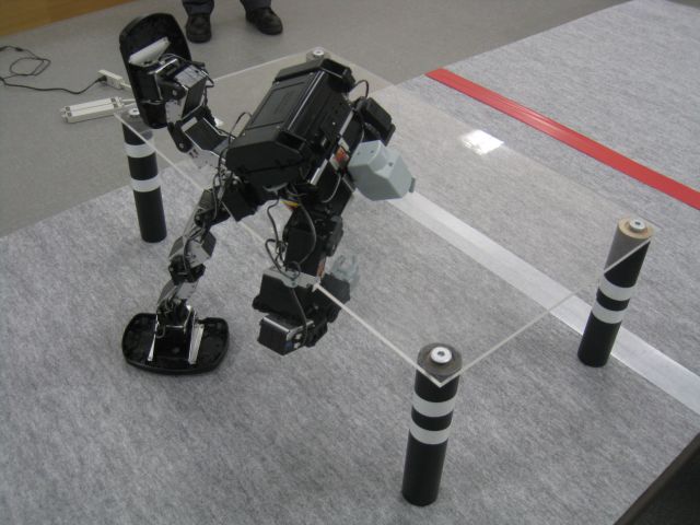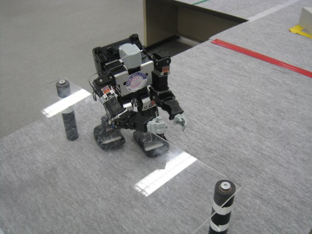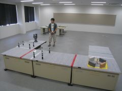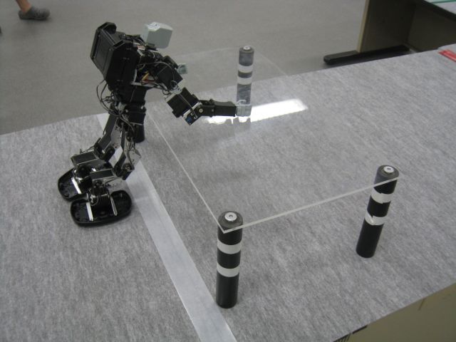 以下の写真は2010年のものですが、配置やタスクは同じです。以下で使っているヒト型ロボットは、近藤科学のKHR-3HVです(身長約400mm)。実際に動作しているわけではなく、電源の入っていない状態でポーズを取らせただけです。