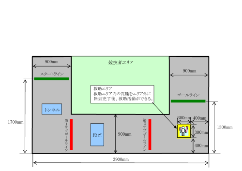 - 要救助者人形の位置と姿勢は、競技開始前に競技者が自由に設定できますが、姿勢に制限が加わりました。人形の腰パーツが床面と接するようにしなければなりません。詳しい説明は、要救助者人形のページを見てください。