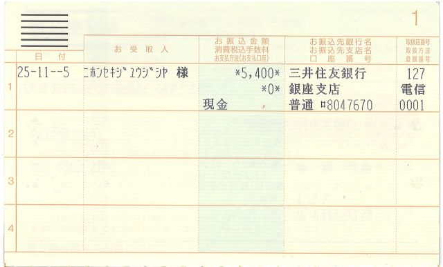 本家レスコン実行委員会の委託を受けて、当日会場で「レスキューホイッスル」(1個200円)を販売したところ、皆様に27個お買い上げいただきました。売上金5,400円は全て日本赤十字社の東日本大震災義援金の口座へ振り込みました。ATMで振り込む際に、誤って振込帳を作ってしまったため、証拠が以下のような画像になってしまいました。