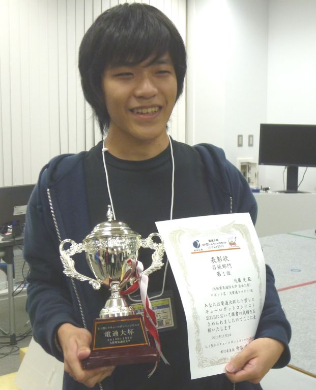 搭載カメラ部門では、審査ポイントが僅差だったが、トンネルくぐりや段差乗り越えを安定した動きが評価され、zeno氏のRB2000SFが第1位となった。目視部門では、人間らしい障害物の乗り越えや丁寧なガレキ除去が審査員に大きく評価され、近藤氏の大電通コマドリー改が第1位となった。また、総合ポイントが最も高い選手に贈られる電通大杯は、近藤氏の大電通コマドリー改となった(画像28、画像29、画像30)。