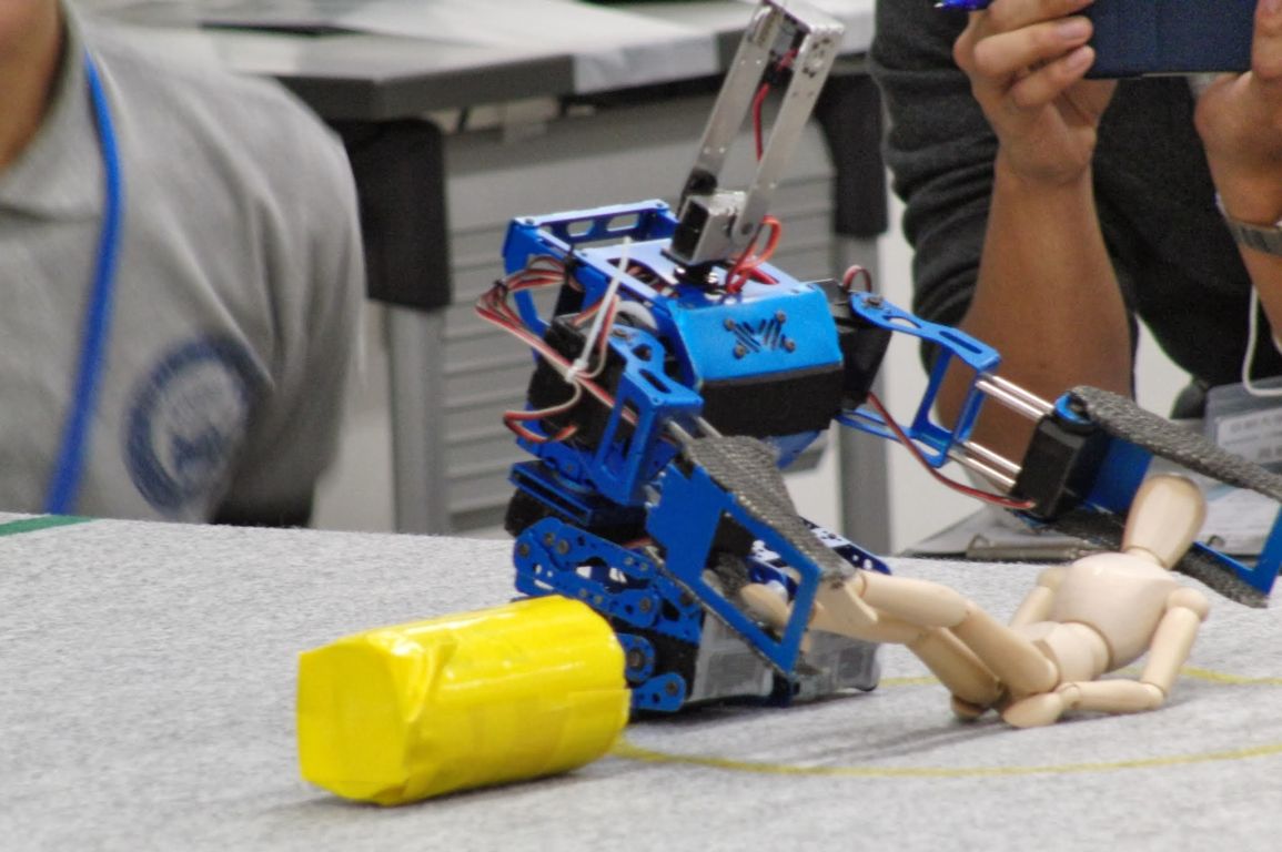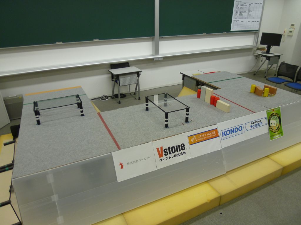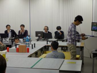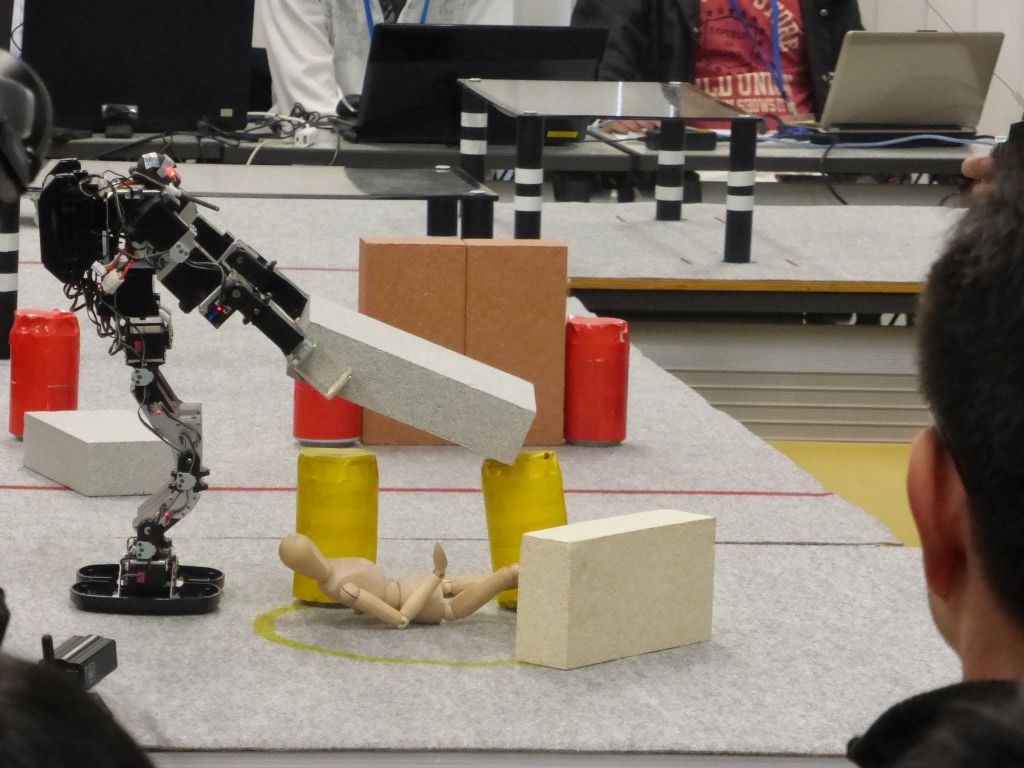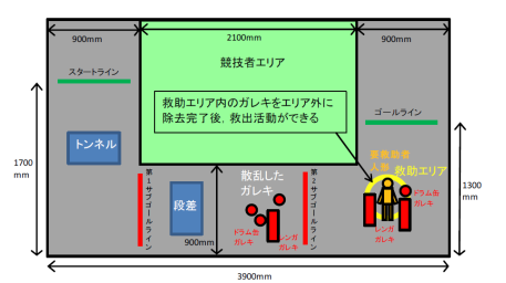 コンテストでは、被災地を模した約4×2mのフィールド内で「トンネルくぐり」「段差乗り越え」「ガレキ除去」「要救助者搬送」の4つのタスクを順にクリアし、要救助者の搬送が完了した残り時間と審査員ポイントの合計を競う。競技の行われるフィールドには、操縦者を囲むようにコの字にコースが作られ、全面に薄いパンチカーペットが敷かれている(画像4、画像5、画像6)。操縦者は、遠隔操作でヒト型ロボットを操作し要救助者役のデッサン人形を救助する。しかし、単に人形を早く拾い上げゴールラインに向かえばいいというものではなく、要救助者を「安全に」扱えているか、「やさしく」救助できているかといったことも審査対象となり、採点が行われる。