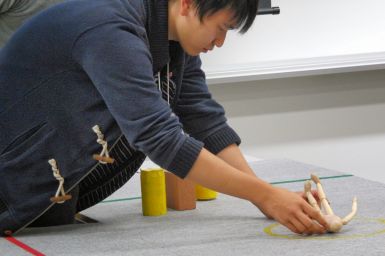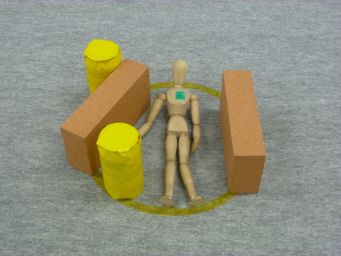 競技は、操縦者が要救助者を模した人形を配置するところから始まる。フィールドの救助エリア内であれば、人形のポーズは操縦者が自由に決めることができる(画像7)。その後、審判がランダムにガレキを配置する。ガレキの配置位置は事前にはわからないため、様々な状況を想定したガレキ除去の戦略が求められる。