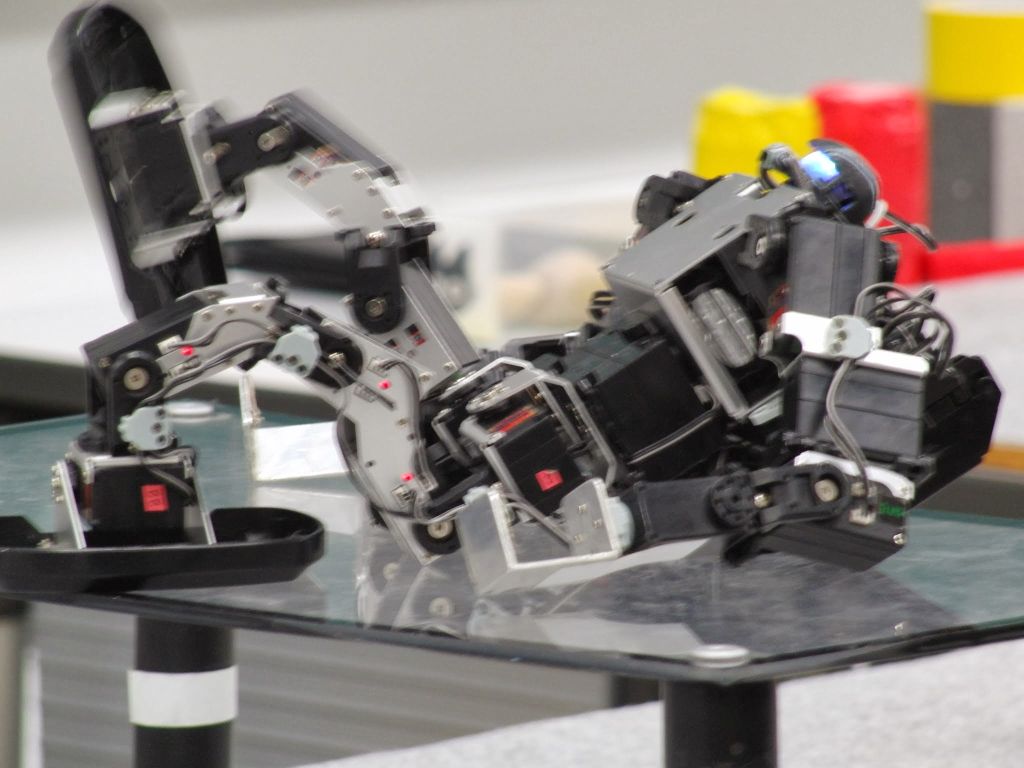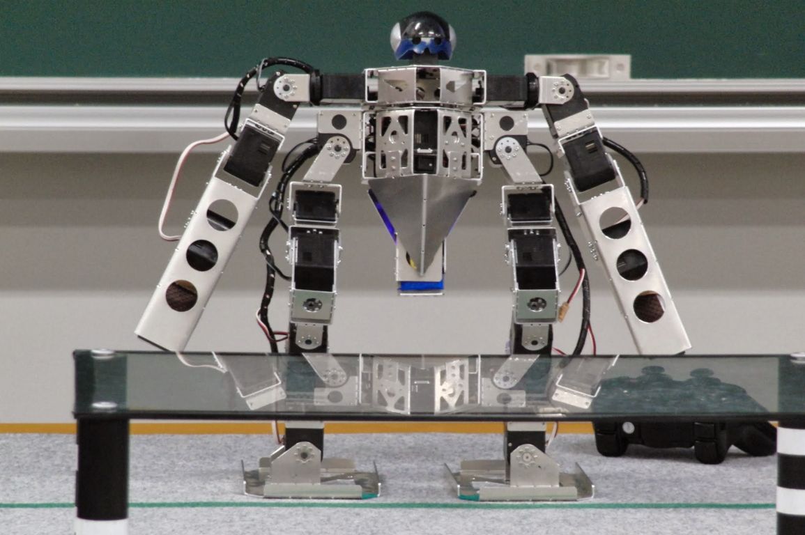 これらの設置後、緑のスタートラインにヒト型ロボットを立たせ、競技が始まる(画像8)。最初のタスクはトンネルくぐりだ。トンネルに見立てた机のような形の障害物の下をくぐる。その天板の高さは、事前に競技者がいくつかの中から選択できる。通過する方法は、腕を使っての匍匐前進や、仰向けになって足で前進するなど様々だ(画像9)。興味深い方法だったのが大電通コマドリー改(近藤氏/大阪電気通信大 自由工房)だ。台車を用いて、その上に仰向けに寝そべり巧みに足を動かすことで前進しトンネルを通過した(画像10)。このように、ヒト型レスコンでは、道具を用いることができ、そのアイディアも採点対象となっている。