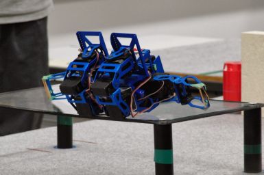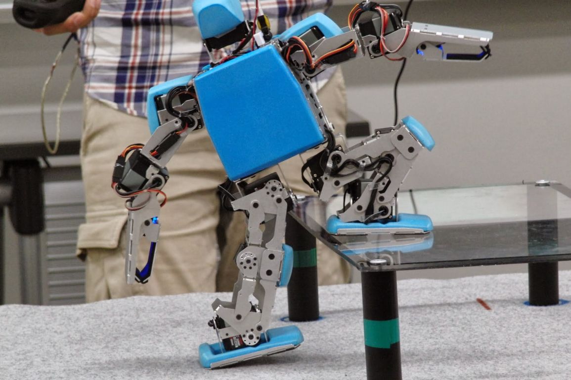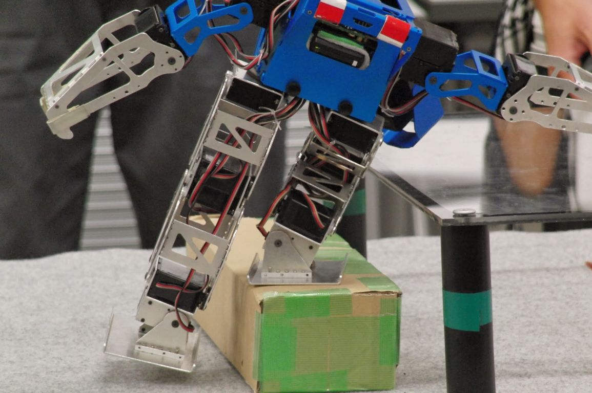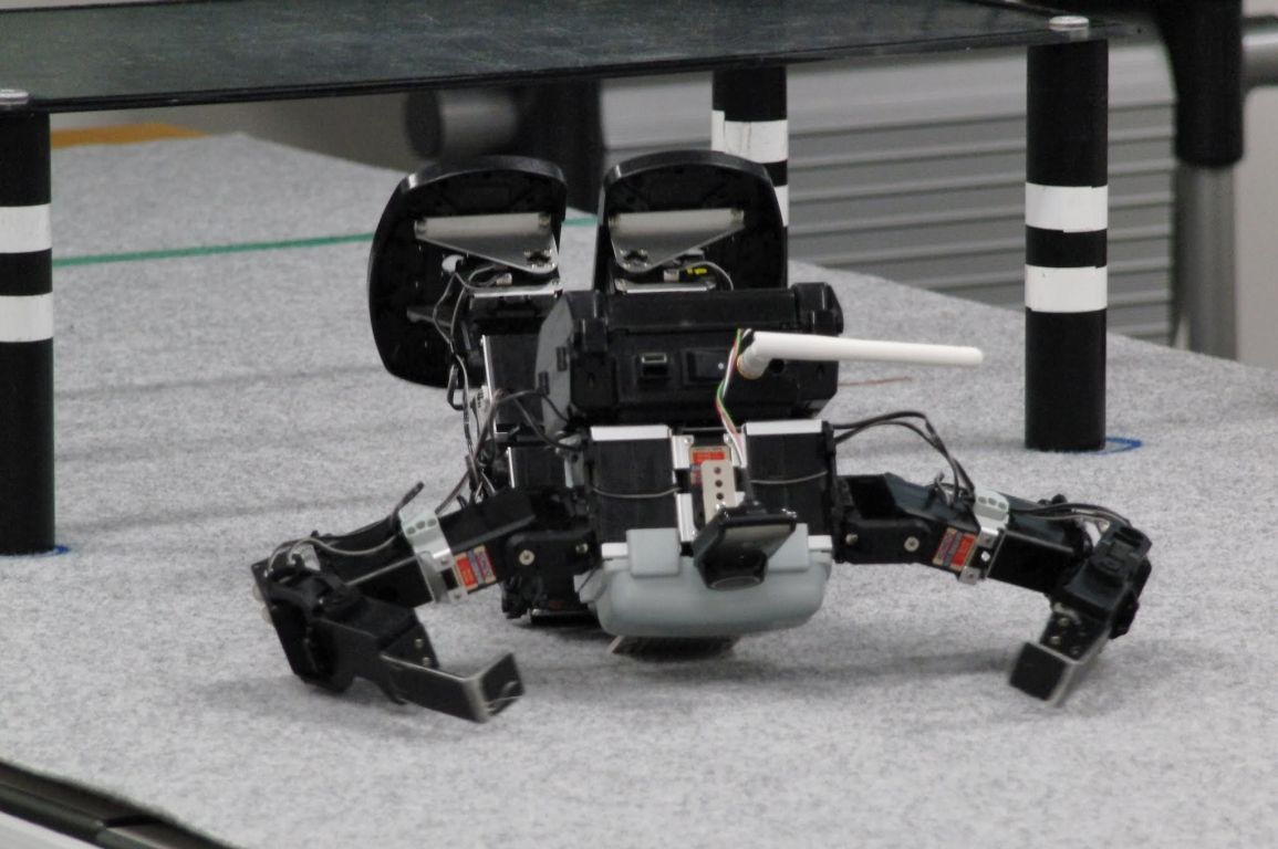 次に待ち構えるのが段差乗り越えだ。段差に見立てた障害物は、トンネルくぐりに使ったものと全く同じもので、高さも同じに設定される。つまり、高いトンネルを選んだロボットは、高い段差を越えなければならない。乗り越えのタスクに対して、段差の上で派手に前転をしたり、段差に腰を下ろし徐々に移動したり、足を大きく持ち上げて段差の上で起立したりと、様々な方法が試みられた(画像11、画像12、画像13)。特に、今回他の競技者と違うアプローチだったのは、道具として踏み台を使用した高嶋氏だ(画像14)。