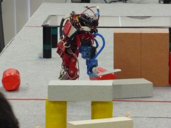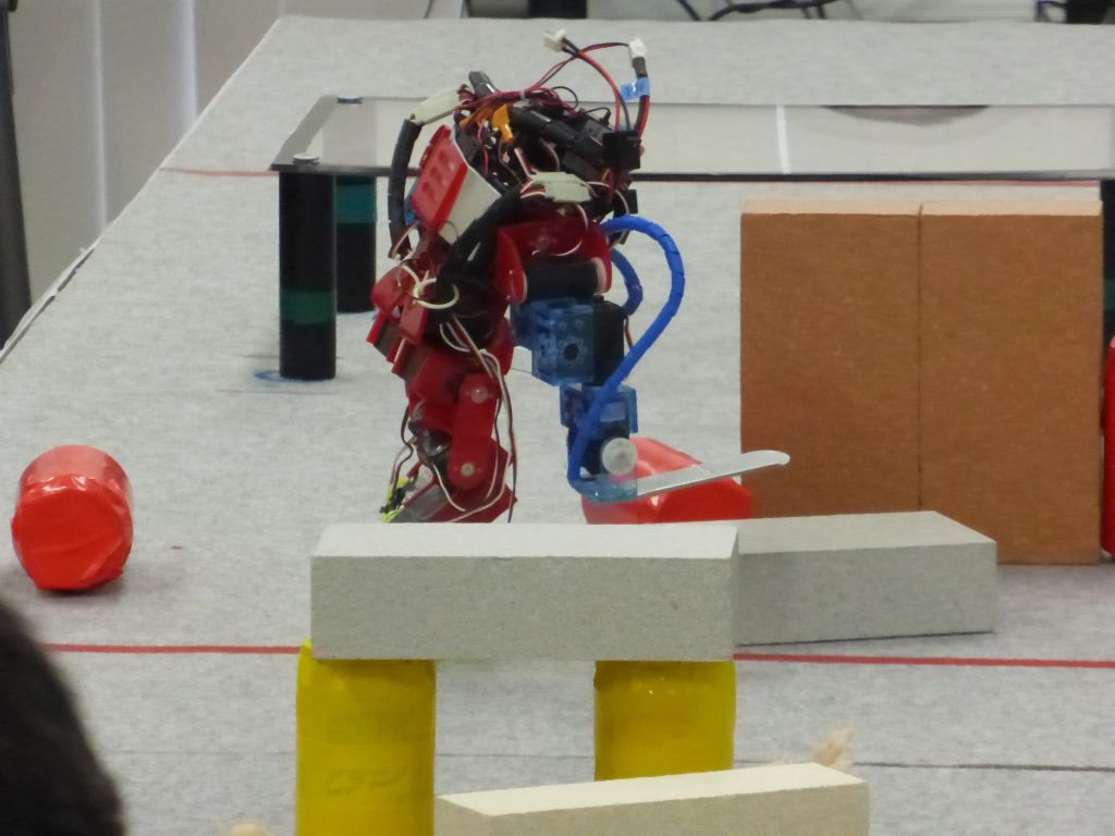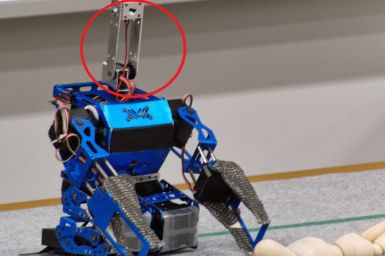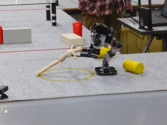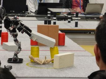 いよいよ要救助者の救出であるが、その前に要救助者の周りにあるガレキを救助エリア(直径32cmの円)の外に除去することが求められている。ガレキを抱えて放り投げたり、手や足で弾き出したりしても構わない。注意しないといけないのが、要救助者の上にガレキを落としたり、ロボット自身が要救助者にダメージを与えたりしてはならないことである。要救助者に気を配りながらやさしくガレキを除去することが重要だ。(画像17、画像18)要救助者に対する危険行為はイエローカードが出され、3枚貰うと失格である。