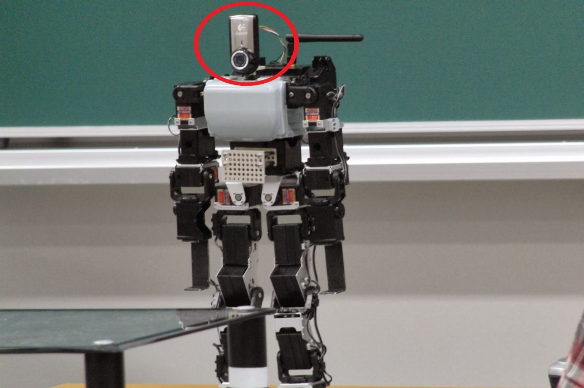 今川氏のRobovie-PC Ver2.0は、ロボット自体に搭載されているコンピュータでWindowsが動いているため、USBカメラを接続し、無線LANを用いてSkypeで映像伝送を行っていた。カメラは、頭部に内蔵されていて、首が人間の様に動き周囲を見渡せるようになっている(画像25)。しかし、下を見るときはロボットの胸部が邪魔で足元が確認しづらいようだった。