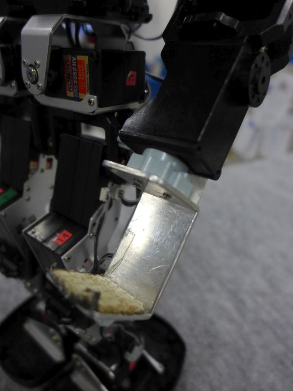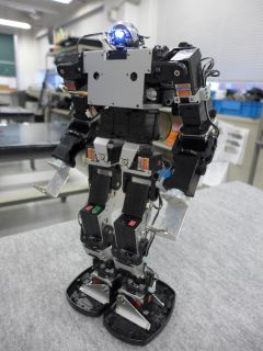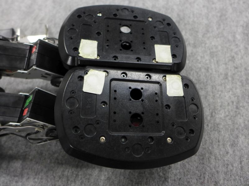 近藤科学のKHR-3HVに拡張用サーボ5個セットを追加しています。腕4軸、脚6軸、腰ヨー軸の21軸。首のヨー軸は使っていません。頭を付け替えていますが、レスキューには意味がありません。腕の先にコの字型のアルミ製の手を付けています。足裏の内側にビニルテープを貼って摩擦を調整しています。